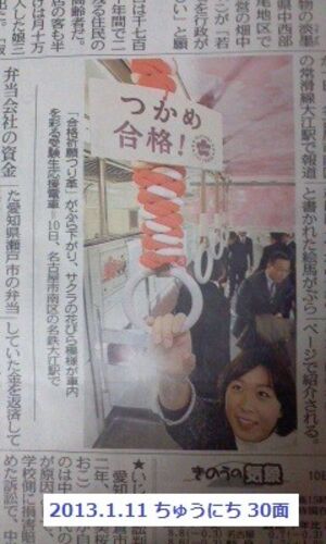 この つりかわに つかまって 合格だ! きょう 2013年 1月 11日から こんな 電車が はしりはじめたげな。 なづけて さくらTRAIN。名鉄 全線を はしるだげなけど、ほの ひ どこを はしるかは 当日 あさの ホームページで 発表との こと。 受験生 諸君、がんば…