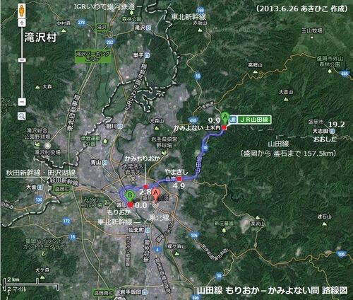 岩手県の 県都、人口 30万人の 盛岡から 四方に 鉄道が のびとる。きたに IGRいわて銀河鉄道と 東北新幹線、みなみに 東北線と 東北新幹線、にしに 田沢湖線と 共用の 秋田新幹線、ひがしに 山田線だ。 △ 山田線 もりおか-かみよない間 路線図 (あきひこ)…