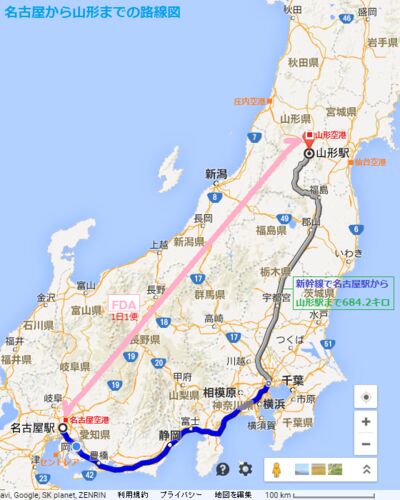 名古屋から新幹線にのって342.0キロで東京にとうちゃく。ほっから新幹線をのりかえてさらに342.2キロで山形にとうちゃく。新幹線だとあわせて684.2キロのきょりをFDA機は1時間とちょっとでとんでいく。2010年なつまでJALが就航しとった名古屋-山形線を、3年…