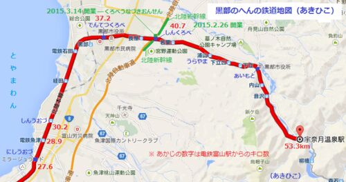 黒部のまちとも在来線黒部駅ともなんの接続もない位置につくっちゃった北陸新幹線の黒部宇奈月温泉駅(くろべうなづきおんせんえき)。なまえからもわかるように、ここで新幹線をおりて宇奈月温泉までクルマがバスでいってね~っていうかんがえでできたえき…