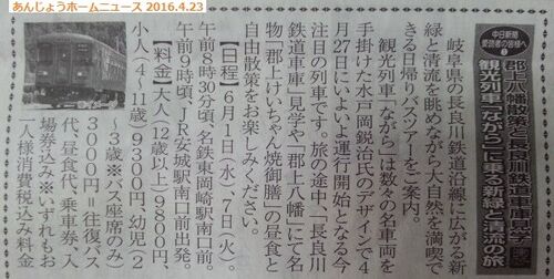 きょう2016年4月23日のあんじょうホームニュースにのっとった。長良川鉄道に2016年4月27日からあたらしく観光列車「ながら」の運行がはじまるだけど、これにのりにいくひがえりバスツアーが企画されたげな。 △ 観光列車「ながら」ひがえりバスツアー - あん…