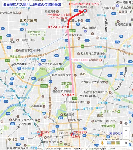 名古屋市バスの路線に名古屋地下鉄名城線の黒川からきたにむかってのびる黒川11系統っていうのがあって、通常は北部市場が終点になっとるだけど、この2017年3月のひとつきかん、名古屋空港までのばす実験がおこなわれた。 △ 名古屋市バス黒川11系統の位置関…