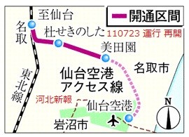 東北線と 共有の 仙台−名取 (なとり)間 10.4kmを のぞく 名取−仙台空港間 7.1kmで 運行 休止が つづいとった 仙台空港アクセス線だけど、ひたちなか海浜鉄道が 全線 復旧に なったのと おんなじ 7月 23日に 名取−美田園 (みたぞの)間 3.8kmの 運行が 再開され、仙台からの のりいれも はじまった。