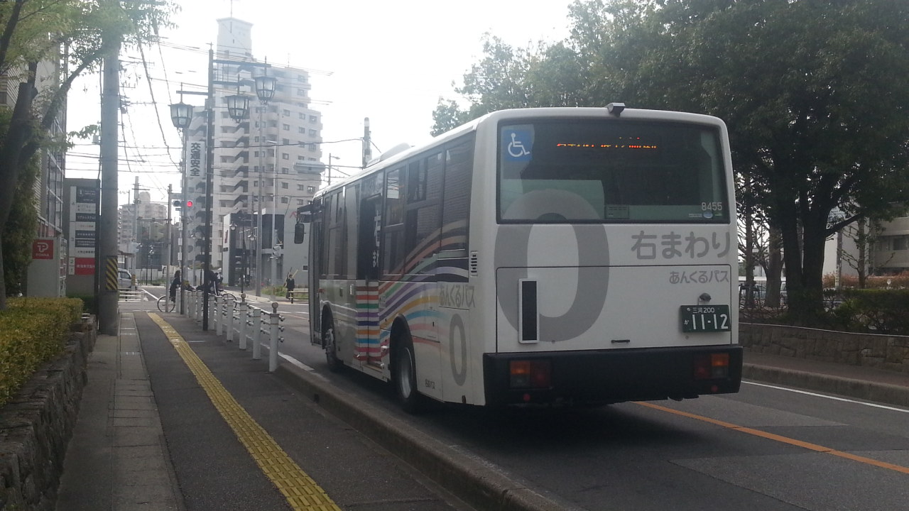 ももいろバスは、おくれにおくれて終点の更生病院にとうちゃく。こっからは車体のおおきなあんくるバスひだりまわり循環線バスだ。なんとかとびのって、のりつぎに成功。市役所どおりをきたにすすみ、南中学校バス停をすぎたとこでみぎまわり循環線バスとすれちがい。