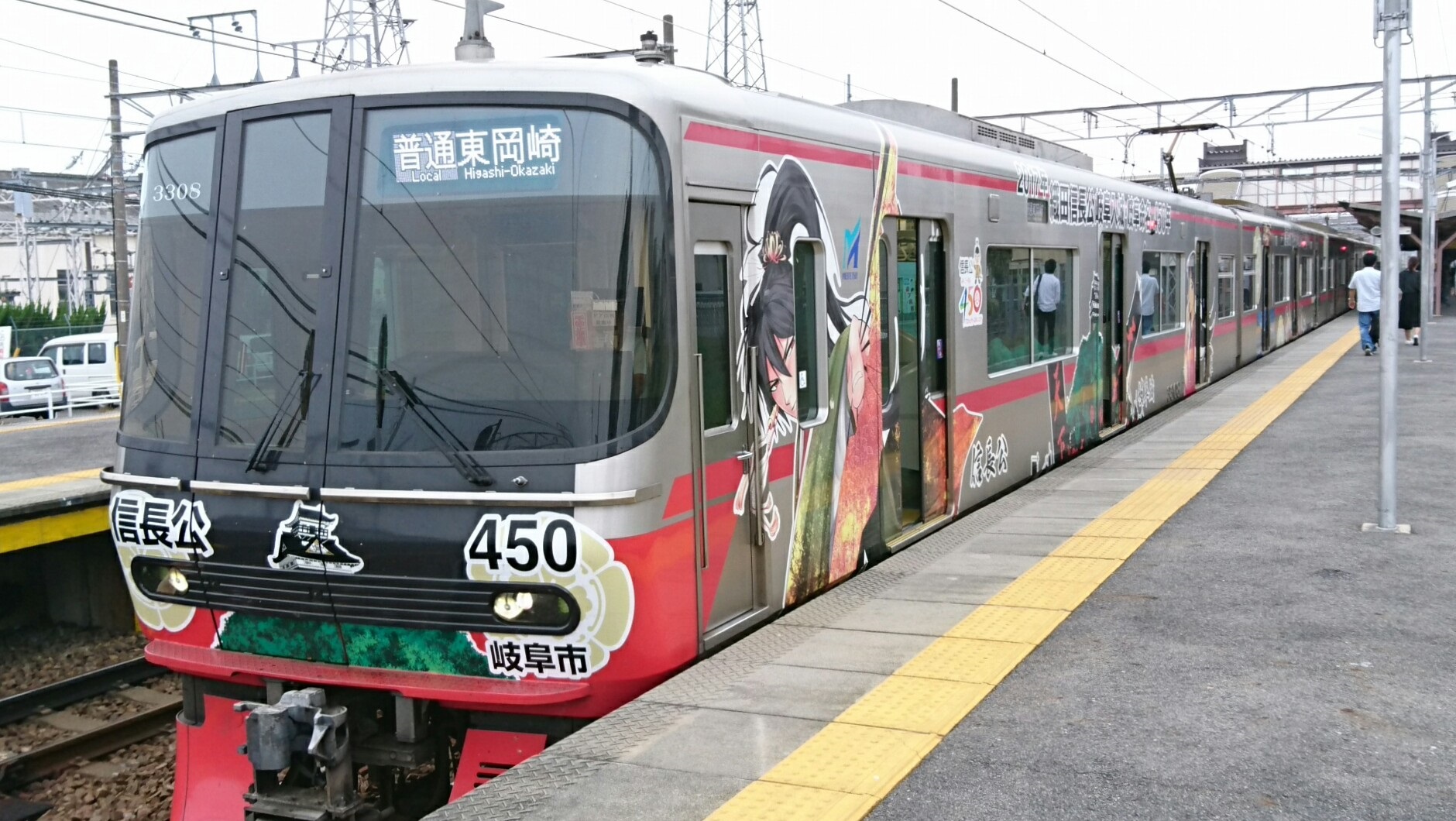 古井16時25分のしんあんじょういきふつうにのって、16時32分、しんあんじょうにとうちゃく。西尾線ホームから名古屋本線さがりホームに移動。しんあんじょう16時35分の東岡崎いきふつうにのる。車両は3300系ぎんいろ電車の4両編成で、信長のえがかいてあるやつだ。